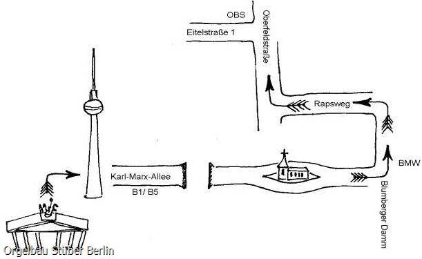 Auf dem östlichen Berliner Ring BAB 10 (aus Süden kommend Richtung Stettin/Prenzlau) bis zur Abfahrt Berlin – Hellersdorf fahren und von dort aus Richtung Berlin auf der B1/5 bleiben. Nach 13,1 km ist die erste Brücke über die Straße in Berlin, danach 1. Möglichkeit rechts (an einem BMW Autohaus) in den Blumberger Damm einbiegen. Diesen fahren Sie bis zur 1. linksabbiegenden Straße (Rapsweg). Der Rapsweg führt auf die Oberfeldstraße, in die Sie rechts einbiegen. Nach 2 kleineren Straßen geht nach links die Eitelstraße ab (gegenüber REWE - Markt).