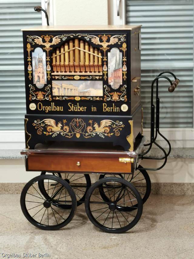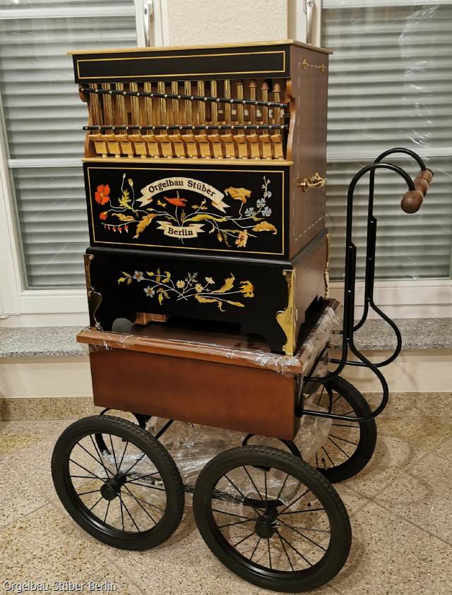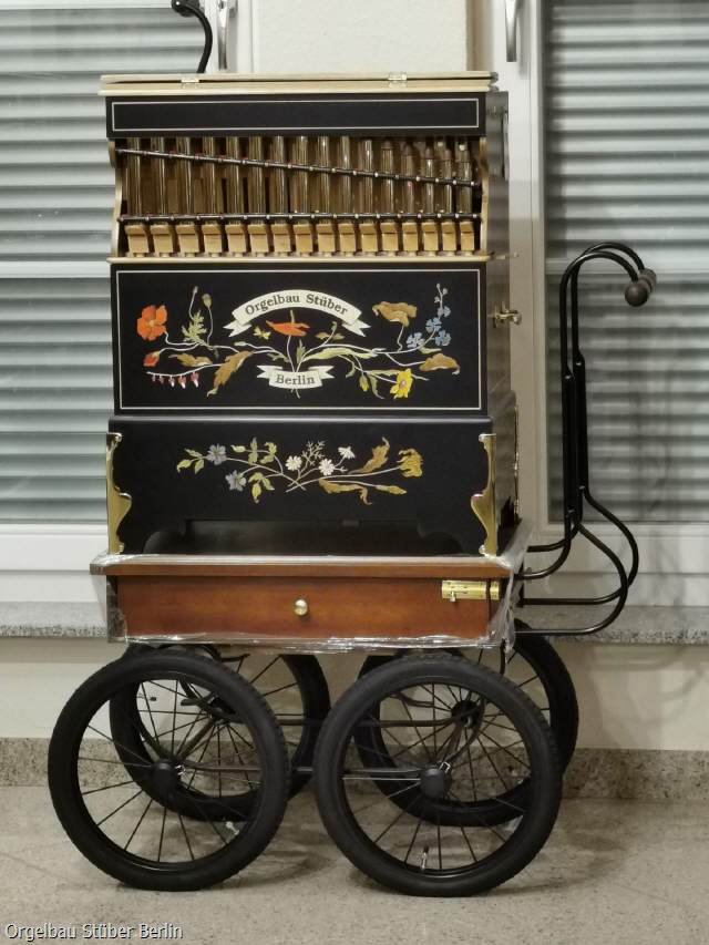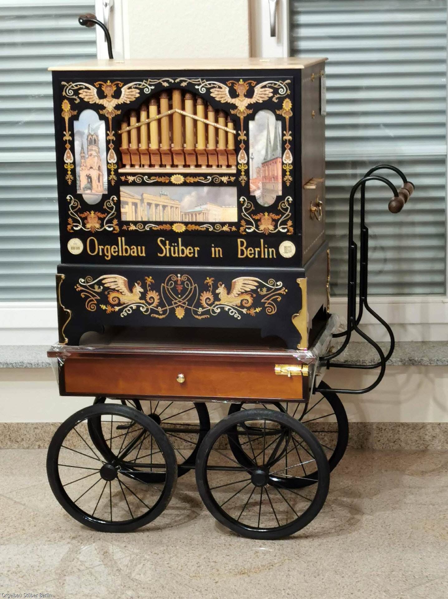 unkomplizierte Straßen-Drehorgel mit ausgewogenem Klang / 31 Pfeifen / 16 Bordunpfeifen / 15 (Pan-) Zauberflöten / Balg mit Doppelschöpfer / aufwendige deutsche Intarsien / massive Messingbeschläge / spielbar mit 31er Musikrollen allen gängigen Hersteller.