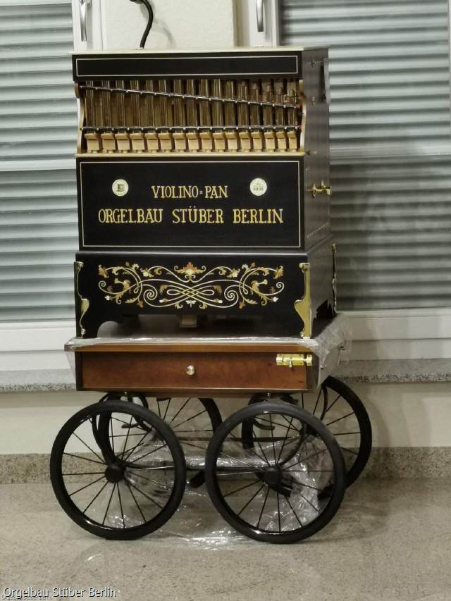 Eine wunderschöne historische Wrede - Drehorgel stand Pate bei der Entwicklung der Violinopan - Drehorgel 31/20er. Welcher alte Drehorgelmann hätte je Register geschaltet, geschweige auf die Walze gepinselte Registrierhinweise geachtet? Diese Drehorgel braucht nicht 8 Register. Der Klang jeder einzelnen Pfeifen ist gefühlvoll intoniert. Das bringt die faszinierende Brillanz des Instruments.
