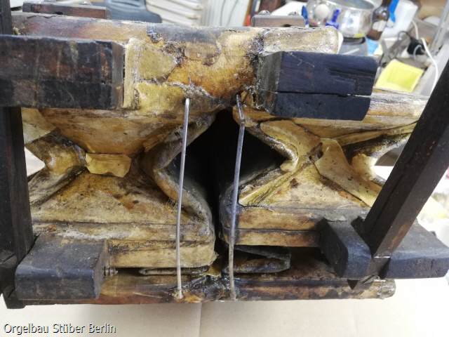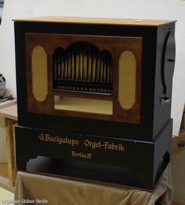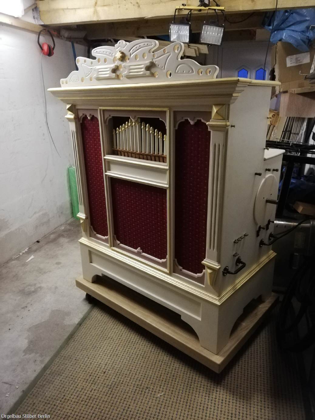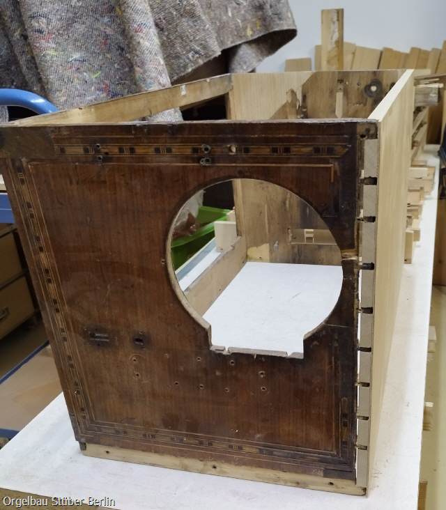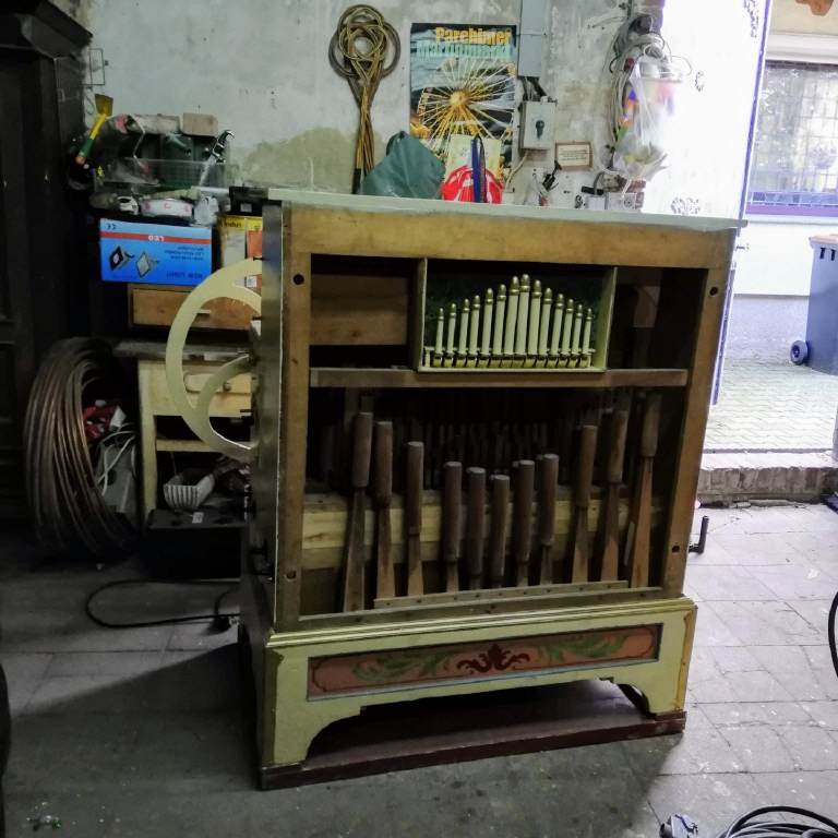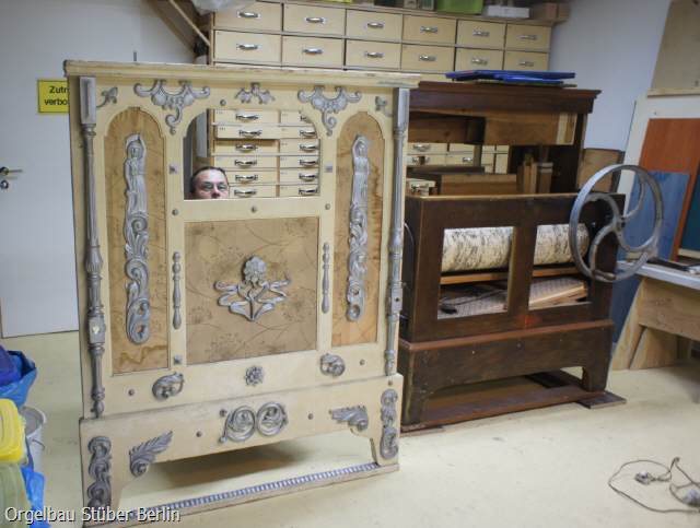 Aufwendig war die Restaurierung einer 41er Ruth-Drehorgel. Der Besitzer hatte schon an vielen Stellen eingegriffen. Das Gehäuse blieb deshalb in unserer Werkstatt unbearbeitet.